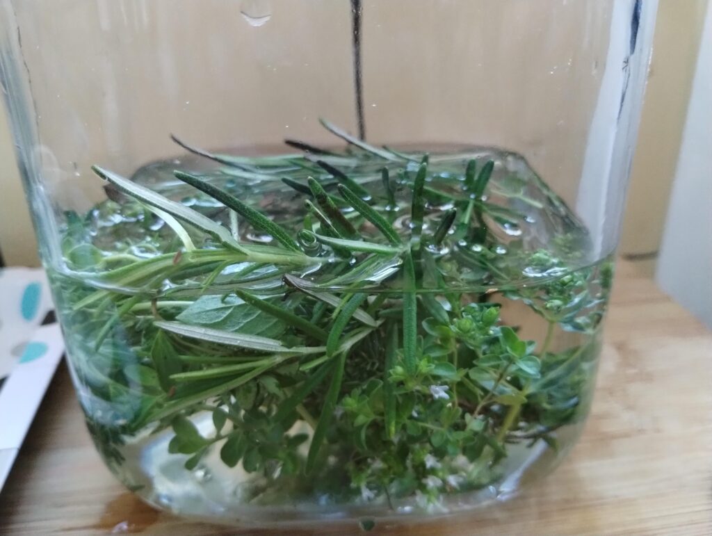 Out with the old, in with the new: I still had some lemon balm tea from last year. It smelled like old leaves, so I dumped it on the compost. And now I’m using the same container to make Kräuterlikör with herbs from my garden: Vodka with rosemary, thyme and oregano. It has to steep for a couple weeks. Then I’ll add tons of sugar to make it really sweet and pour it into smaller bottles. Should make great Christmas gifts.